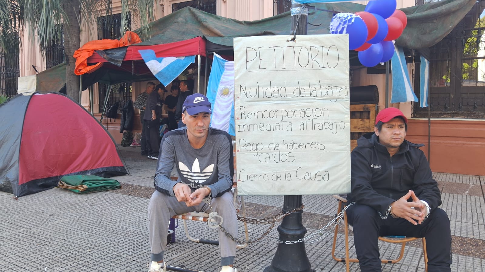 La protesta con acampe frente a Casa de Gobierno, protagonizada por ex policías que participaron de la protesta de mayo de 2024 y hoy reclaman su reincorporación a la fuerza provincial, cumplió una semana con cinco encadenados y una notificación entregada por Gendarmería Nacional Argentina (GNA) por el uso de uniformes reglamentarios estando fuera de servicio.