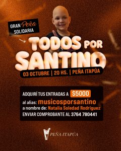 El abono para el concierto cuesta $ 5.000 y se debe realizar al alias MUSICOSPORSANTINO, que pertenece a la mamá del niño, Natalia Rodríguez. Justamente, la madre de Santino confirmó esta mañana a Radioactiva que Santino todavía “no está 100% recuperado, le cuesta generar defensas” y que por continuar su tratamiento en el Hospital de Niños Ricardo Gutiérrez, en Buenos Aires, “por ahora no tenemos fecha de regreso a Posadas”.