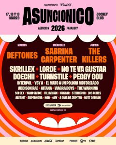 Se dio a conocer hoy que el festival Asunciónico 2026 tendrá en su cartelera a los estadounidenses Deftones, Skrillex, Turnstile, Interpol, The Killers y Sabrina Carpenter. También estarán El Mató a un Policía Motorizado, No Te Va Gustar, Viagra Boys, Ysy A y muchas bandas más el 17, 18 y 19 de marzo, en el Jockey Club de Asunción del Paraguay.
