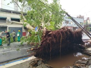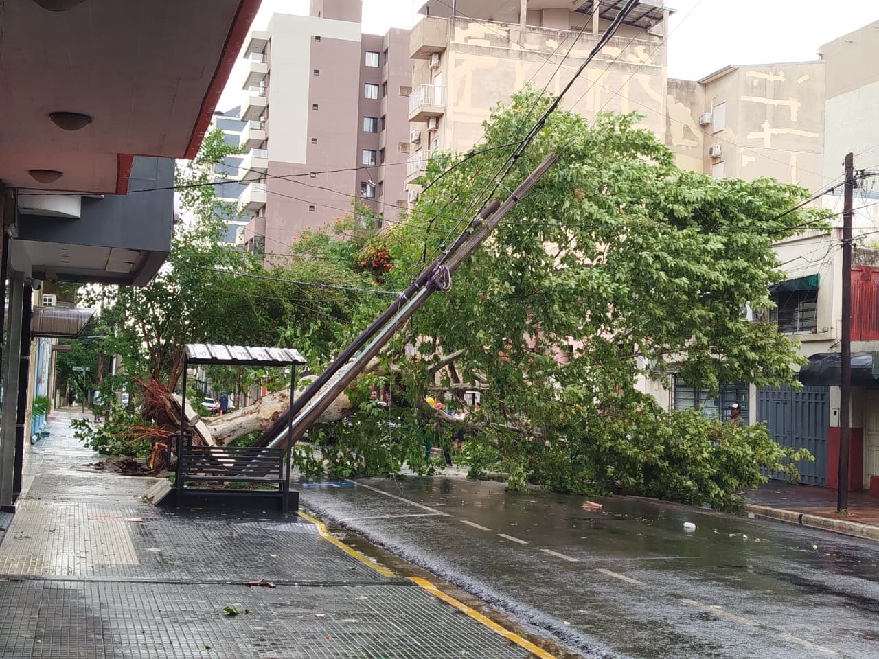 Uno de los hechos se registró en inmediaciones de las calles Belgrano y casi Tres de Febrero, donde un árbol se desprendió desde la vereda y cayó atravesando la calle hasta quedar sobre la acera del frente, lo que dificultó la circulación por la zona.