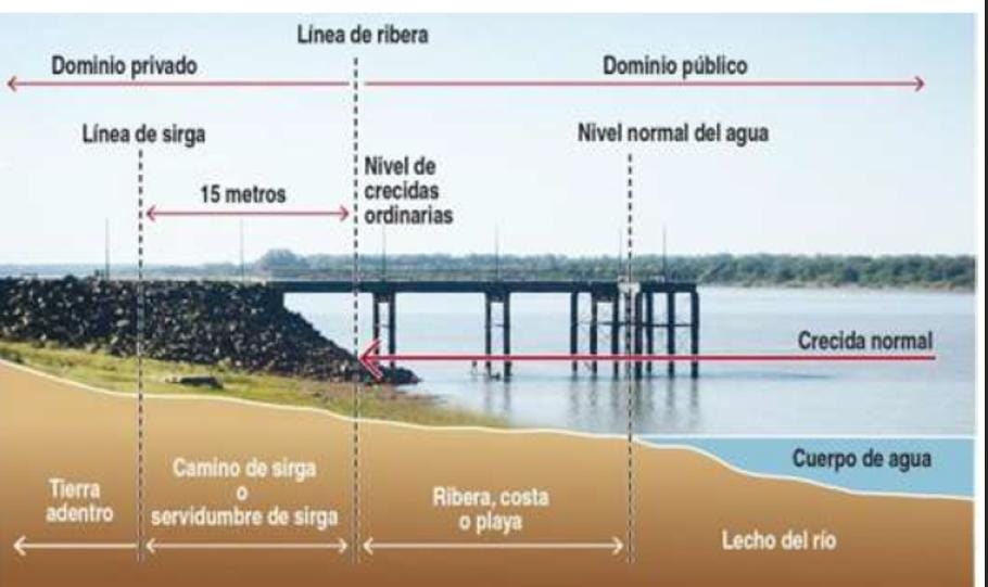 ¿De qué se trata? El camino de sirga se encuentra en el capítulo correspondiente a los límites al dominio, cuyo objetivo es permitir sirgar, esto es, remolcar o arrastrar una embarcación desde la orilla. Se aplica a cursos de agua navegables y consiste en una franja de terreno que paso de 35 metros a solo 15 desde la línea de ribera. Aunque es propiedad privada, el propietario no puede realizar en él ningún acto (ejemplo construcciones) que menoscabe la actividad del transporte fluvial. Parte de la doctrina, desde un enfoque que observa el ordenamiento jurídico integral, ha dicho que esa actividad no solo se debe reducir al transporte, sino también a la pesca y al esparcimiento. Lo que hay que entender es que el rio es un bien de dominio público (art. 235) y por ende se debe permitir el acceso a él. Para el derecho no es aceptable el acceso a determinado espacio del rio, debe ser sobre su totalidad.