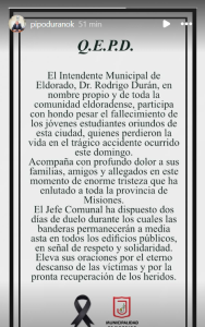 En el comunicado, se indica que el jefe comunal “acompaña con profundo dolor a sus familias, amigos y allegados en este momento de enorme tristeza que ha enlutado a toda la provincia de Misiones.
