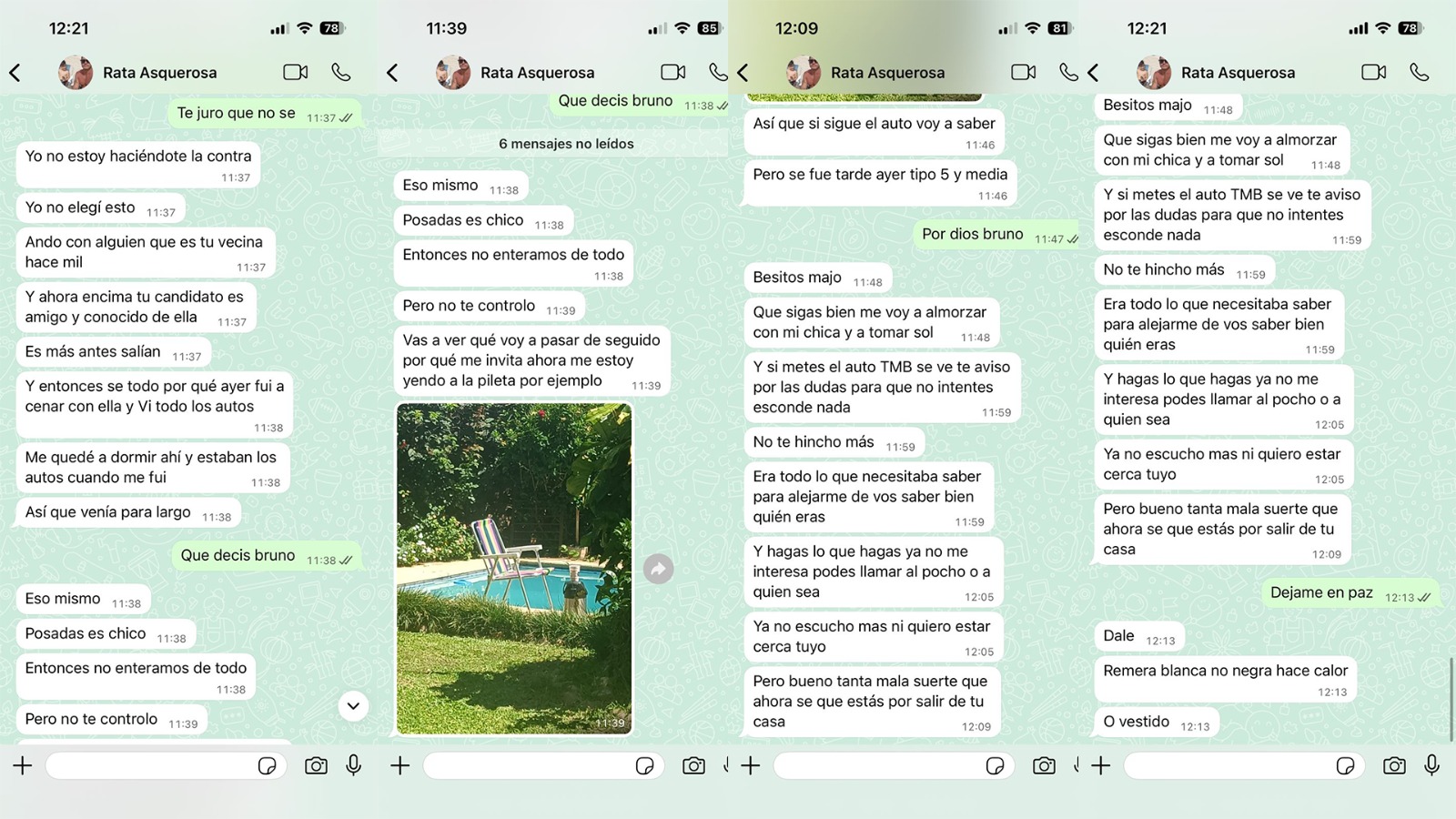 “El jueves antepasado hice una reunión acá con amigos, comimos un asado y esto lo vi en la cámara el otro día. Mi amigo, mi último amigo se fue a las 5.55 y a las 5.56 recibo un mensaje de él. El primero fue eliminado. Después de eso era torrencialmente una lluvia de puteadas. Que vos sos una trola, que ya sé que andas con un pelotudo que tiene un Corola, que te voy a prender fuego la casa, que si te encuentro te voy a romper la nariz, te voy a tirar algo por la cabeza, porque vos sos una reverenda puta”, recordó María José, entre otros insultos recibidos.