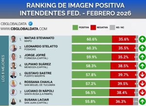 Con el 54,7% de imagen positiva, Passalacqua, aparece en quinto lugar en el ranking de febrero de 2026 de la consultora que dirige el analista Cristian Buttié, y que ubica en la cima del podio al gobernador sanjuanino Marcelo Orrego, con el 60,1% de valoración positiva.