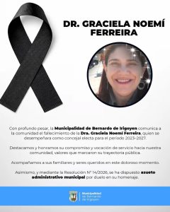 Este lunes, la Municipalidad de Bernardo de Irigoyen comunicó con “profundo pesar” el fallecimiento de la médica cirujana y concejal por el Frente Renovador Neo, Graciela Noemí Ferreira, y declaró asueto administrativo por duelo en la localidad.