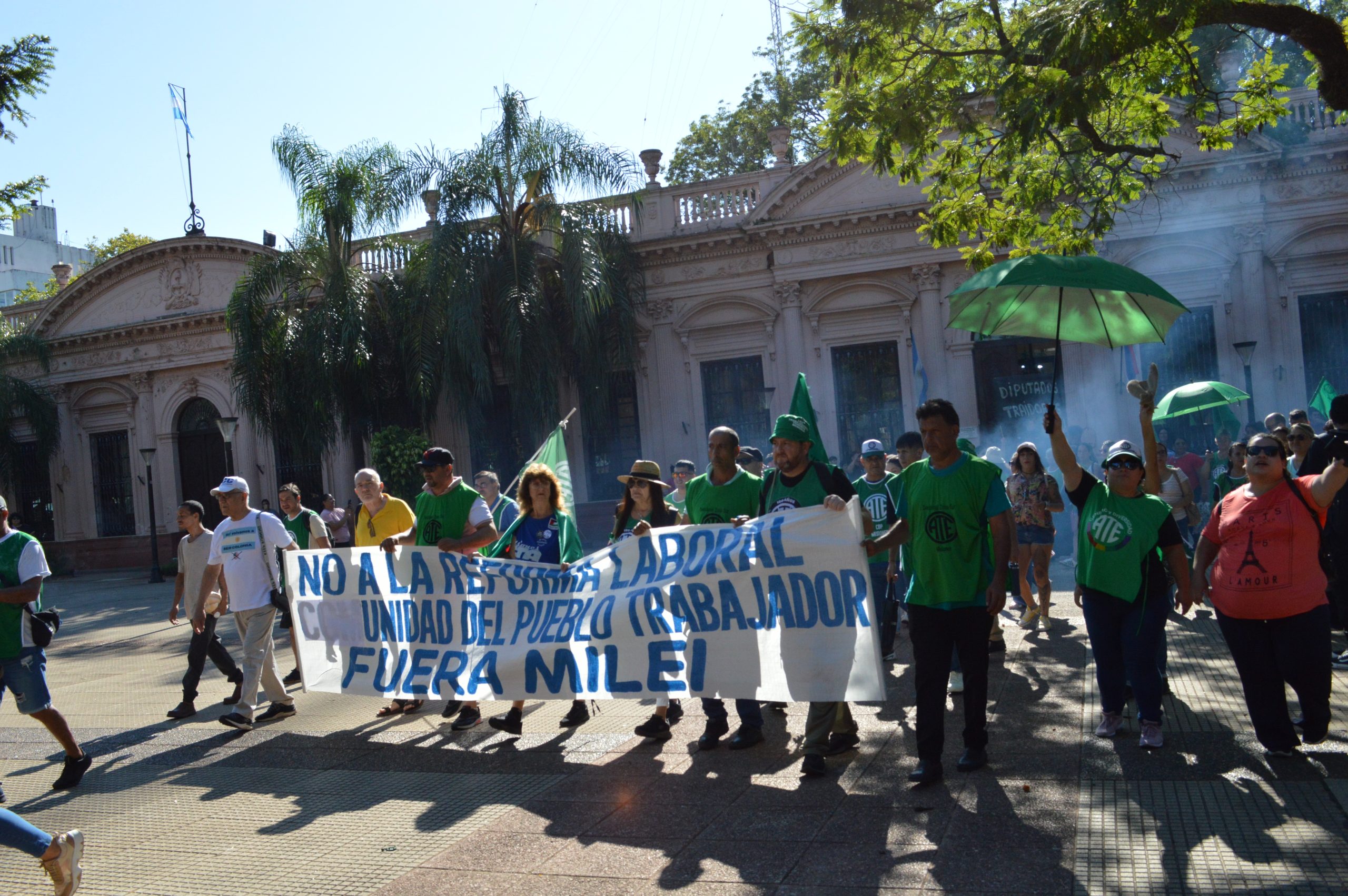 La columna ocupó al menos dos cuadras y se desplazó por calle Junín, desde el Mástil de Uruguay y Mitre hasta la Plaza 9 de Julio, donde referentes del Asociación Trabajadores del Estado (ATE), la Central de Trabajadores de la Argentina (CTA), la Corriente Clasista y Combativa (CCC), el Partido Obrero (PO) y otras agrupaciones, brindaron discursos advirtiendo sobre los riesgos de la aprobación e implementación de la reforma laboral en el país.