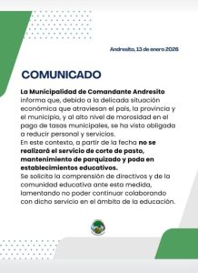 El comunicado fue difundido ayer a través de la cuenta oficial de Instagram y el escrito señala que el municipio “se ha visto obligada a reducir personal y servicios” e indicó que “a partir de la fecha no se realizará el servicio de corte de paso, mantenimiento de parquizado y poda en establecimientos educativos”.
