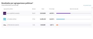 Según los datos publicados en el sitio web de la Dirección General del Centro de Cómputos de la provincia, donde se encuentran alojados los resultados del escrutinio provisorio de las elecciones legislativas, La Libertad Avanza (LLA) ganó en 32 de los 78 municipios y cosechó el 37,18% de los votos en toda la geografía provincial con el 100% de las mesas escrutadas.