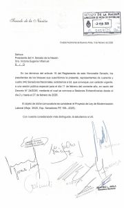Con la firma los senadores Carlos Omar Arce, del Frente Renovador Neo, y Martín Goerling Lara, del PRO Misiones, los bloques parlamentarios afines a la Casa Rosada oficializaron el pedido de sesión especial para tratar el próximo miércoles en el Senado el proyecto de Reforma Laboral que desvela al gobierno de Javier Milei.