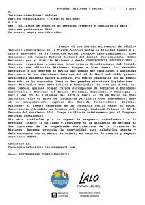 “Atento el contubernio existente, de público y notorio conocimiento en la tierra colorada, entre La Libertad Avanza y el Frente Renovador de la Concordia Social (ACUERDO RENO-LIBERTARIO), como Integrante del Consejo Federal Nacional del Partido Justicialista -Orden Nacional por el Distrito Misiones y desde CONVERGENCIA JUSTICIALISTA Misiones requerimos a nuestros Interventores-Normalizadores del Partido Justicialista -Distrito Misiones- tengan a bien tomar los recaudos necesarios a los efectos de evitar que puedan ser candidatos a Autoridad Partidaria en las elecciones internas del 19 de Abril del 2026, quienes actualmente ostentan Cargos Electivos y/o fueron Candidatos por el Frente Renovador de la Concordia (Neo) en las pasadas elecciones legislativas, tanto Nacionales como Provinciales y Municipales de este año 2.025, así como también quienes ocupen Cargos Jerárquicos del Gobierno, Entidades Autárquicas o Empresas del Estado -Nacional, Provincial y Municipal- a partir del 10 de Diciembre del 2025 y hasta el 19 de Marzo de 2026 inclusive”, reza la nota.