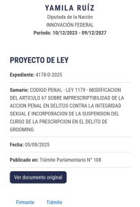 La diputada nacional del bloque Innovación Federal, Yamila Ruíz, presentó en el Congreso de la Nación, un proyecto de ley que busca modificar el artículo 67 del Código Penal y eliminar la prescripción de los delitos sexuales, incluyendo casos de grooming.