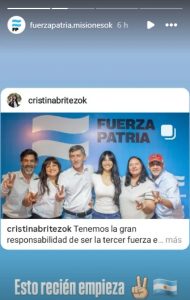 La publicación de Convergencia viene a cuento de los posteos de Fuerza Patria Misiones en Instagram, donde la candidata kirchnerista de Eldorado y quienes la acompañaron en la lista, celebran el resultado electoral y destacan la “gran responsabilidad” que significa “ser la tercera fuerza” en Misiones.
