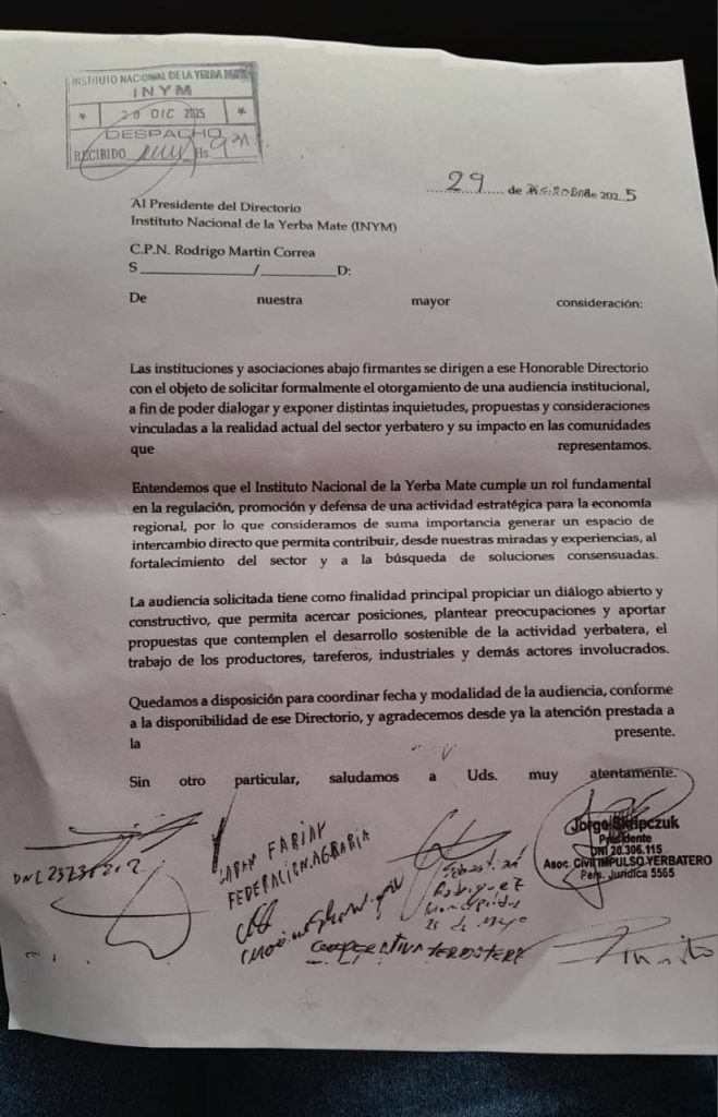 En el documento al que tuvo acceso La Voz de Misiones, expresaron: “Las instituciones y asociaciones abajo firmantes se dirigen a ese Honorable Directorio con el objeto de solicitar formalmente el otorgamiento de una audiencia institucional, a fin de poder dialogar y exponer distintas inquietudes, propuestas y consideraciones vinculadas a la realidad actual del sector yerbatero y su impacto en las comunidades que representamos”.