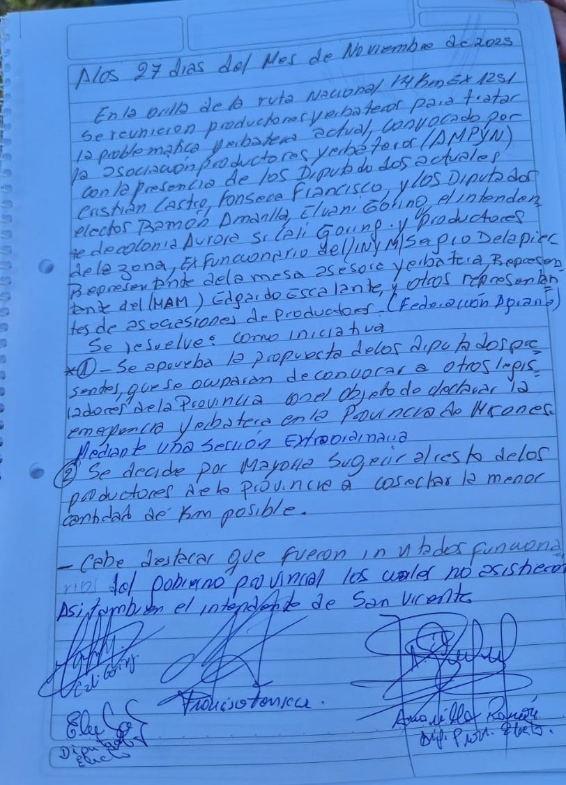 A través de un comunicado, los miembros de Ampym, manifestaron: “Durante los últimos meses, la realidad económica que enfrentan los productores se ha tornado insostenible, producto de la falta de cumplimiento del precio justo de la hoja verde y la yerba canchada, valor que hoy no cubre los costos reales de producción ni garantiza la continuidad del trabajo de miles de familias rurales”.