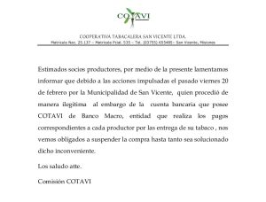 La Oficina de Rentas de la Municipalidad de San Vicente intimó a la Cooperativa Tabacalera San Vicente Ltda. (Cotavi) a regularizar una deuda que supera los 264 millones de pesos en concepto de Derecho de Inspección, Registro y Servicio de Controlador, correspondiente a los períodos fiscales 2024 y 2025.