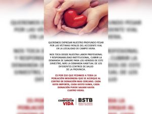 “Queremos expresar nuestro profundo pesar por las víctimas fatales del accidente vial en la localidad de Campo Viera. Nos toca desde nuestra labor profesional y responsabilidad institucional, cubrir la demanda de sangre para los heridos de este siniestro, más la demanda habitual de los diferentes centros de salud de la provincia”, ahondaron en el escrito.