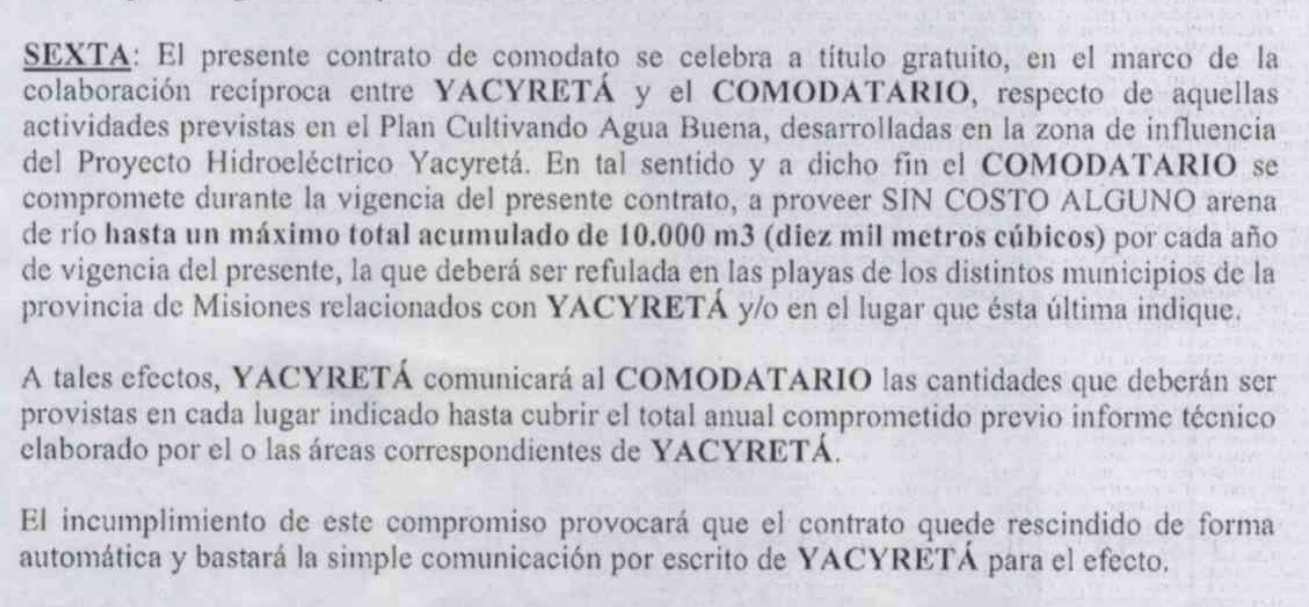 La cláusula Sexta del Contrato de Comodato entre la EBY y Arenera “Don Adolfo” conserva el aspecto más relevante del acuerdo entre las partes, que comienza notificando: “que se celebra a título gratuito, en el marco de colaboración recíproca entre YACYRETÁ y el COMODATARIO”.